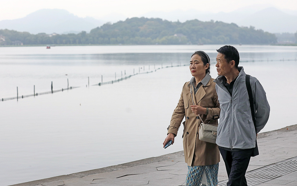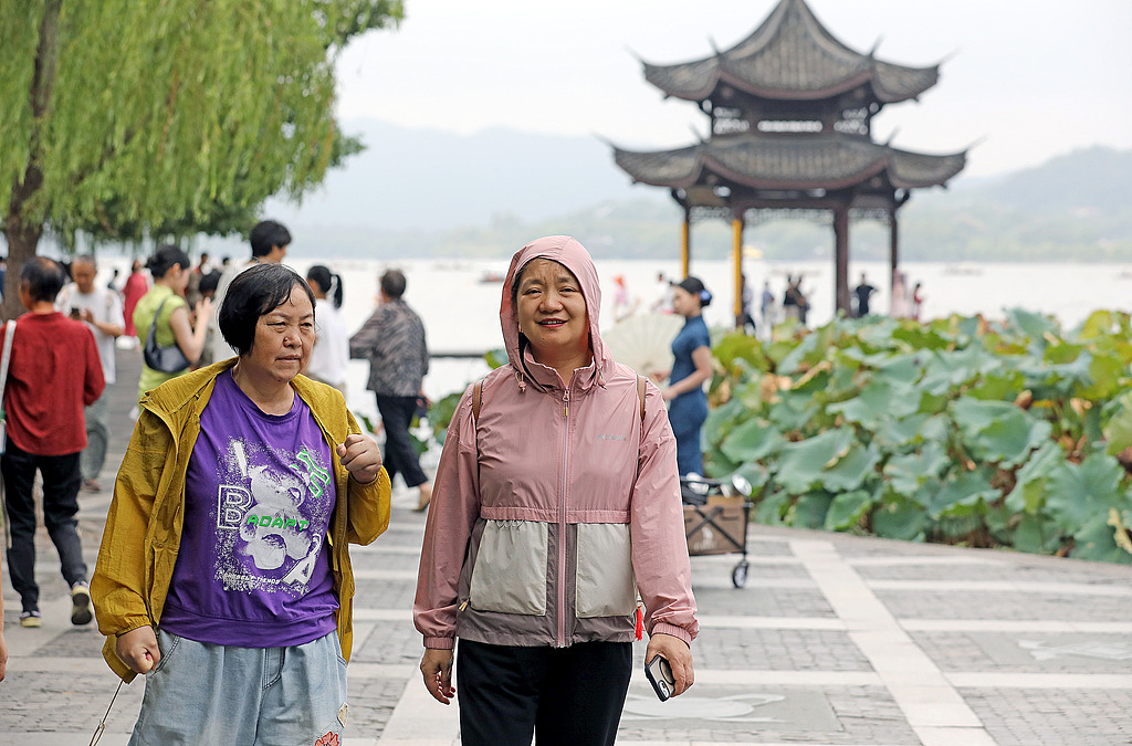 10月14日,西湖景区不少游客换上防风外套等秋装,在微凉景致中惬意赏景。