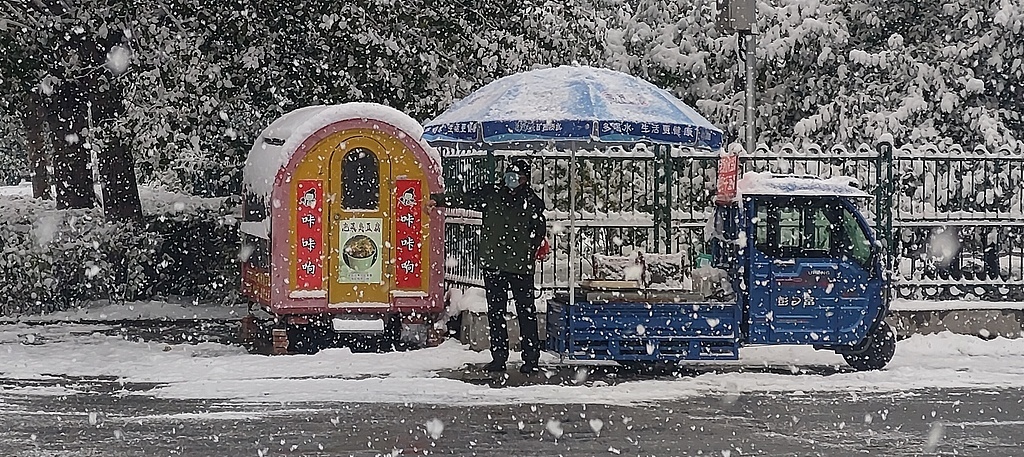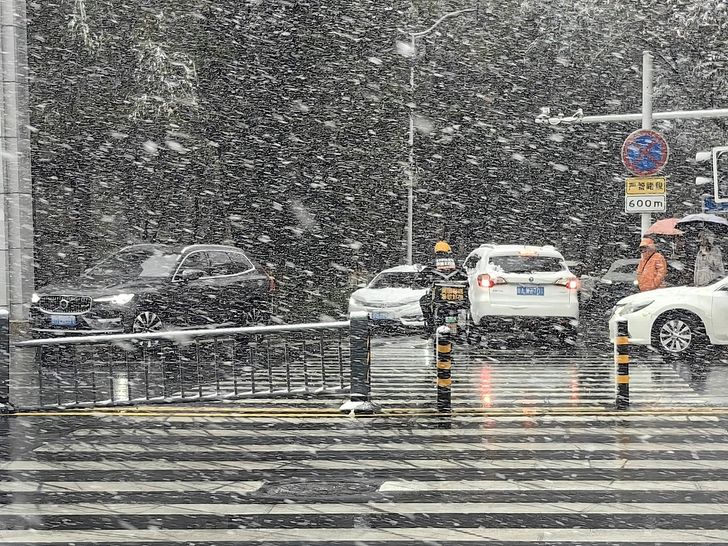 10月15日,新疆乌鲁木齐,当地迎来首场降雪,市民在早高峰时段出行。